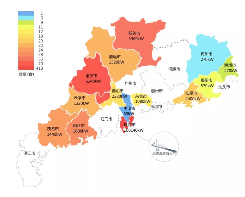 2018年,在港珠澳大桥充电桩项目中,北京博晓科技发展有限公司在港珠澳大桥珠海端口岸人工岛搭建的充电管理平台及电能量采集终端,为大桥的绿色运营和电力保障提供技术支持。除此之外,仅广东省内,北京博晓科技发展有限公司充电桩涵盖肇庆、珠海等14个城市,具体分布情况如下图所示。